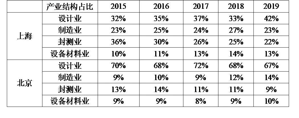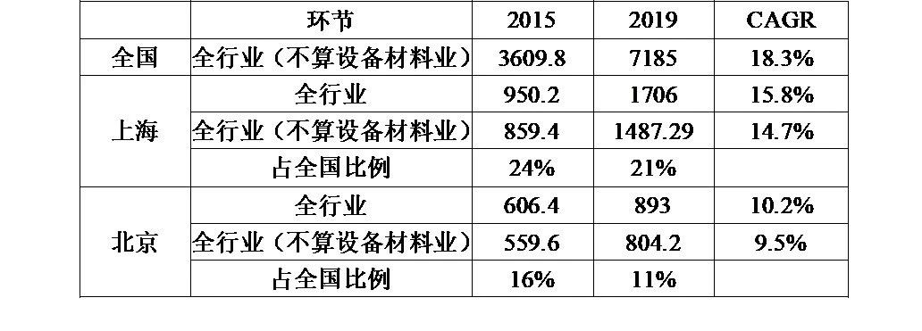 表2:2015-2019年上海及北京集成電路各產業環節的收入及增速