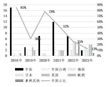 圖1 2018年-2023年全球新增晶圓廠所在國家及地區分布