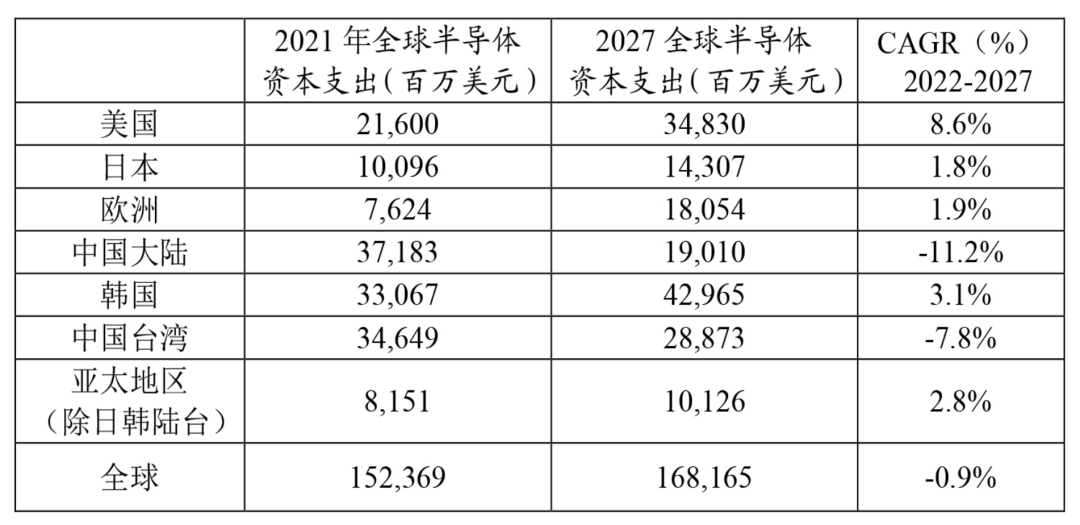 表2:2021-2027年全球半導體資本支出區域分布