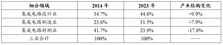 表1 2014-2023年我國集成電路產(chǎn)業(yè)三大主業(yè)產(chǎn)業(yè)結(jié)構情況