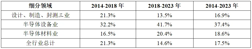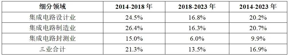 表2 2014-2023年我國集成電路產(chǎn)業(yè)三大主業(yè)銷售收入年均復合增速情況