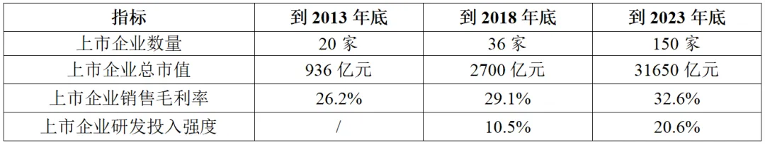 資本市場助力產(chǎn)業(yè)升級,上市企業(yè)數(shù)量質(zhì)量雙飛躍。根據(jù)東方財富金融數(shù)據(jù)統(tǒng)計(表4),截止到2013年底,我國實現(xiàn)A股上市的半導體企業(yè)僅有20家,總市值不足千億元,平均銷售毛利率26.2%。而到2023年底,上市企業(yè)數(shù)量超過150家,總市值超過3萬億元,平均銷售毛利率32.6%。尤其是2018-2023年,由于科創(chuàng)板的設立,帶動集成電路產(chǎn)業(yè)在資本市場實現(xiàn)“加速跑”,5年間上市企業(yè)數(shù)量和總市值分別實現(xiàn)超過4倍和10倍的增長,上市企業(yè)平均銷售毛利率和研發(fā)投入強度也實現(xiàn)大幅躍升。