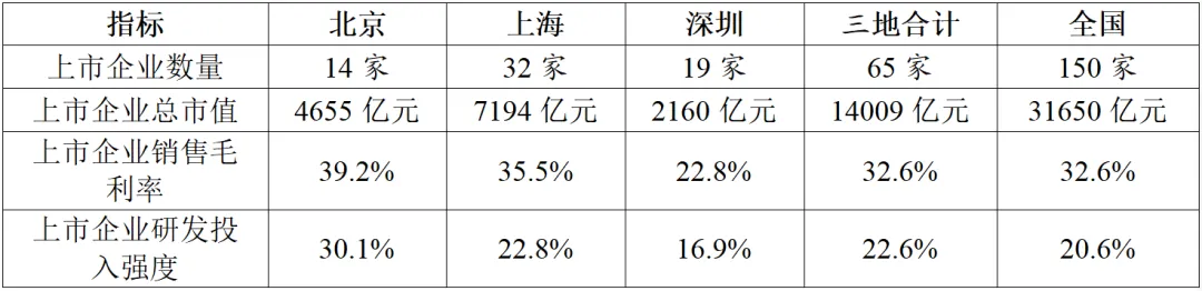 在企業(yè)發(fā)展方面,北京上市企業(yè)發(fā)展質(zhì)量最高,上海上市企業(yè)數(shù)量和總市值最多。根據(jù)東方財富數(shù)據(jù)(表7),截止到2023年底,北京、上海、深圳分別擁有14家、32家、19家半導體領域的上市企業(yè),總市值分別為4655億元、7194億元、2160億元,合計上市企業(yè)數(shù)量和總市值占到全國的40%以上。其中上海上市企業(yè)的數(shù)量和總市值最多,而北京的上市企業(yè)發(fā)展質(zhì)量最高,銷售毛利率和研發(fā)投入強度分別達到39.2%和30.1%,遠超全國平均水平。