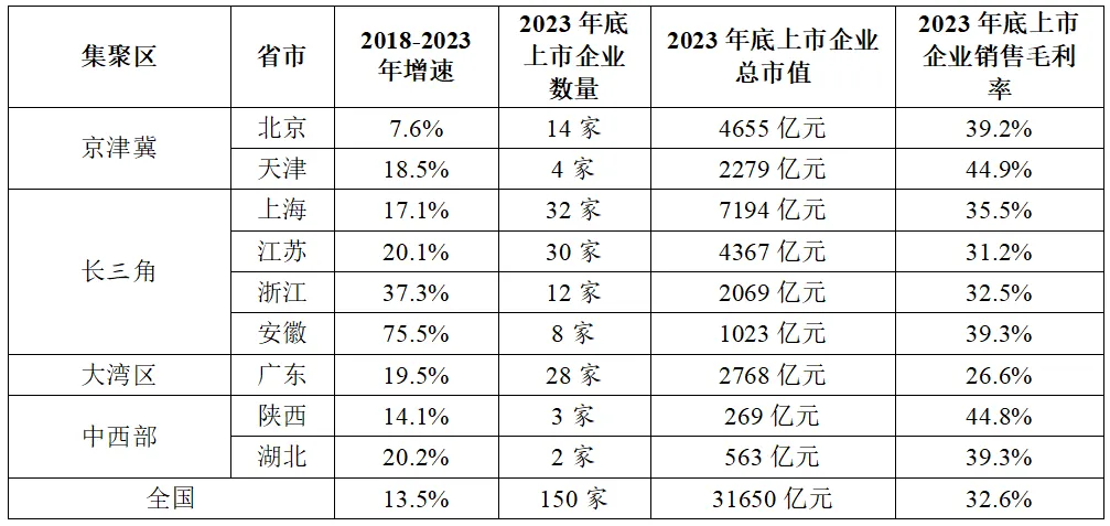 從企業(yè)發(fā)展來看,京津冀和中西部上市企業(yè)發(fā)展較為優(yōu)質(zhì),中西部上市企業(yè)數(shù)量和總市值仍有上升空間。根據(jù)東方財富數(shù)據(jù)(表9),截止到2023年底,在我國150家半導體上市企業(yè)中,82家來自長三角地區(qū),占比接近一半,總市值占比也接近一半。而京津冀和中西部上市企業(yè)的銷售毛利率遠超國內(nèi)全行業(yè)上市企業(yè)平均水平,企業(yè)質(zhì)量較為優(yōu)質(zhì)。但中西部地區(qū)的上市企業(yè)數(shù)量和總市值與其他地區(qū)存在較為明顯的斷層差距,仍存在一定的上升空間。
