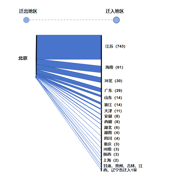 據(jù)相關(guān)統(tǒng)計(jì),2016年以來,共有948家國家高新技術(shù)企業(yè)遷出北京市2。其中,83.12%的企業(yè)選擇遷往長三角、珠三角等地區(qū),選擇留在津冀的企業(yè)僅占4%。其中,江蘇省成為最受歡迎的省份,遷入企業(yè)數(shù)量高達(dá)743家(49.78%),南京、徐州、蘇州成為遷入企業(yè)數(shù)量最多的城市。除此之外,海南省也吸引了61家北京高新技術(shù)企業(yè),外遷時(shí)間集中在2020-2021年期間。