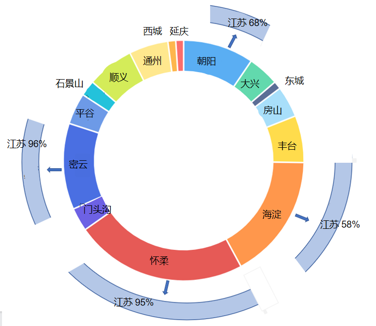 從北京各區(qū)高新技術(shù)企業(yè)的外遷情況來看,懷柔區(qū)、海淀區(qū)、密云區(qū)和朝陽區(qū)外遷企業(yè)數(shù)量最多,其中懷柔區(qū)、密云區(qū)存量高新技術(shù)企業(yè)數(shù)量本身較少,不足600家,但外遷數(shù)量卻位于各區(qū)前兩位,首位是懷柔區(qū),近7年來有200家高新技術(shù)企業(yè)外遷;其次是密云區(qū)有100余家高新技術(shù)企業(yè)外遷,95%以上的外遷企業(yè)都選擇前往江蘇省。