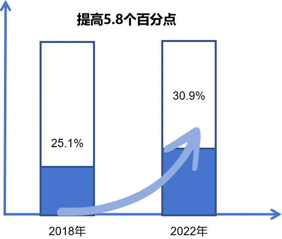 從增加值看,2018年全市高精尖產(chǎn)業(yè)實(shí)現(xiàn)增加值7610.3億元,占地區(qū)生產(chǎn)總值比重為25.1%;2022年全市高精尖產(chǎn)業(yè)實(shí)現(xiàn)增加值12857.8億元,占地區(qū)生產(chǎn)總值比重達(dá)到30.9%[2],較2018年提高5.8個(gè)百分點(diǎn)。