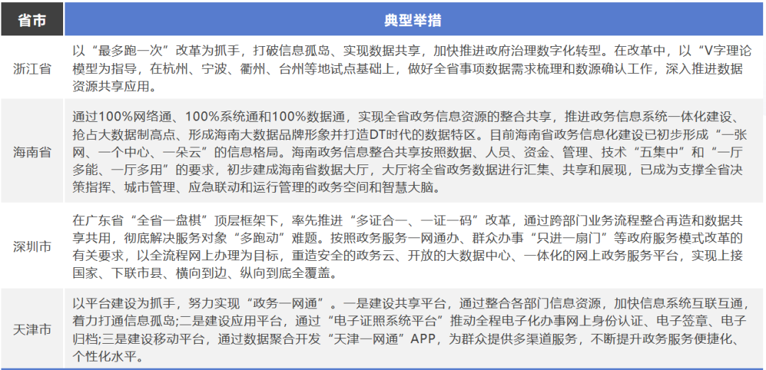 自國(guó)務(wù)院出臺(tái)《政務(wù)信息系統(tǒng)整合共享實(shí)施方案》以來(lái),各地在結(jié)合其電子政務(wù)建設(shè)現(xiàn)狀基礎(chǔ)上相繼開(kāi)展了政務(wù)信息系統(tǒng)整合共享工作(詳見(jiàn)表1),但也面臨政務(wù)信息系統(tǒng)條塊分割、數(shù)據(jù)共享不充分、管理機(jī)制不健全等問(wèn)題,進(jìn)一步推進(jìn)政務(wù)信息系統(tǒng)整合、加強(qiáng)數(shù)據(jù)匯聚融通依然任重道遠(yuǎn)。本文從政務(wù)信息系統(tǒng)基礎(chǔ)設(shè)施、數(shù)據(jù)、應(yīng)用、功能、管理、運(yùn)維、資金七個(gè)方面進(jìn)行闡述,以為相關(guān)部門(mén)開(kāi)展政務(wù)信息系統(tǒng)整合工作提供借鑒。