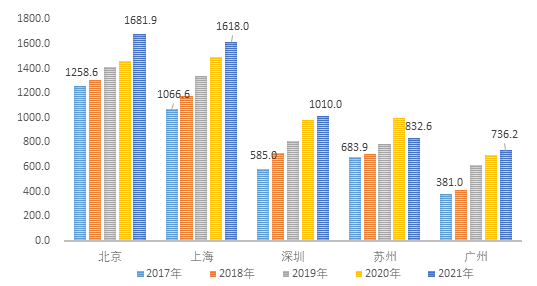 一、產業規模:京滬差距逐漸拉平,廣州增長最為強勁