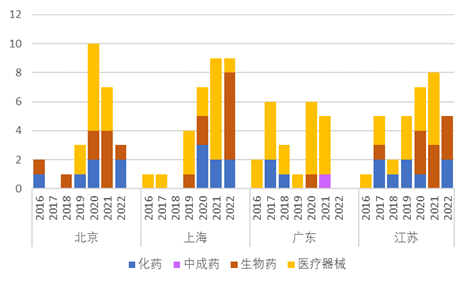 從上市企業看,北京布局多元化,上海和江蘇生物藥領域表現亮眼,廣東醫療器械實力領先。北京在不同領域都有實力強的上市藥企,如中藥領域有同仁堂集團,化藥領域有悅康藥業,生物藥有天壇生物,器械有萬東醫療等。但近幾年上海和江蘇生物藥企業發展更勝一籌,2022年上海有6家生物藥企業上市,江蘇近三年保持每年有3家生物藥企業上市。廣東藥品企業上市呈下降趨勢,但醫療器械企業表現突出,自“十二五”以來上市數量最多,共計18家。