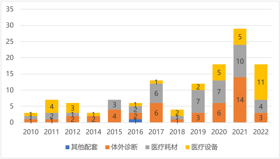 圖2 中國A股醫療器械產業各年上市企業數量 從上市時間看,近三年高峰涌現。自2011年起,醫療器械企業上市活躍度逐漸上升,2020-2022年國內醫療器械行業迎來上市熱潮,三年間上市企業合計數量占總數的比重達到近一半,其中體外診斷企業上市表現尤為突出,三年合計上市23家;2022年醫療設備類企業成為上市主力,有11家相關企業上市。 從所屬地域看,南方地區活躍度較高。廣東省上市企業29家,江蘇省上市企業19家,上海市上市企業18家,浙江省上市企業11家,以上四地上市企業占全國總數的55.8%。北方地區以北京市、山東省兩地較為突出,北京市上市企業18家,山東省上市企業10家,兩地上市企業占全國20.3%。 二、經營分析 (一)醫療器械行業實現穩健增長,2022年營業收入同比增長約24.5% 2022年,醫療器械上市公司業績穩健增長,138家醫療器械上市公司實現營業收入達4139億元,其中體外診斷領域約2181億元、醫療設備領域約1011億元、醫用耗材領域約944億元,相比2021年醫療器械上市公司實現的營業收入總額3324億元,增長約24.5%。在過去三年,醫療器械行業受抗疫帶來的需求推動、實施分級診療政策導致的采購需求增加、國產化替代進程加速等多方面積極影響,呈現了蓬勃發展的態勢。 具體來看,其中有94家企業實現了營業收入同比增長,占比68.1%,其中有7家企業實現營業收入翻倍:九安醫療(997.8%)、安旭生物(287.97%)、明德生物(272.12%)、亞輝龍(237.95%)、蘭衛醫學(136.13%)、怡和嘉業(113.64%)、凱普生物(109.39%)。除了怡和嘉業為醫療設備類企業外,其余均為體外診斷類企業。 有44家企業營業收入同比下滑,其中有11家來自體外診斷領域,17家來自醫用耗材領域,15家來自醫療設備領域。其下滑的主要原因: 體外診斷領域:由于新冠檢測試劑產品在國內外市場競爭日益激烈,導致新冠抗原檢測試劑產品的銷售需求和單價顯著下降,對公司業績產生巨大負面影響。 醫用耗材領域:受新冠事件影響,全球對一次性防護產品的需求激增。然而,2022年供需關系和市場環境發生巨大變化導致產能過剩。中小廠商之間的價格競爭促使終端價格回落至常態化水平甚至更低,因而醫用耗材企業的營業收入同比下滑。 醫療設備領域:受國際局勢影響,醫療設備行業長期處于能源短缺、全球物流效率大幅下降和供應緊缺的態勢中,導致全球芯片及電子元器件等關鍵物料的價格大幅上漲。此外,消費端需求釋放減緩并出現結構化升級等因素也對醫療設備企業的業績產生了影響。 表1 2022年我國醫療器械上市企業營收規模TOP10