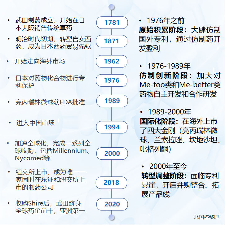 卷首語: 醫藥健康是全球新一輪科技產業變革中最為密集、投資最為活躍的領域,具備“高風險、高投入、高回報、長周期”的典型特征,10年研發周期、10億美元投入、低于10%的成功率成為原創重磅級產品創新的行業共識。 21世紀之前,中國以化學藥為主的醫藥制造業基礎薄弱,基本依靠仿制藥發展,90年代數家國內藥企依托首仿藥成長成為本土龍頭企業。2000年以來,在國家戰略布局、重大新藥創制專項等促進下,在政策、資本、人才等多因素共同驅動下,我國生物醫藥自主創新進程加快,創新層次從派生藥(Me-too)、改進藥(Me-better)向原研首創藥(Me-first)攀升,尤其是近年來,審評審批改革、上市許可持有人制度(MAH)等拉動創新型藥品醫療器械臨床和上市提速,仿制藥一致性評價和醫保改革倒逼加大創新投入,CXO賦能進一步加速創新研發進程,醫藥領域創新不斷蓄力、加快轉化為發展新動能。 本研究通過對國內外典型藥企創新產品研發模式進行案例分析,歸納梳理了“以仿養創”的轉型升級之路、巨頭企業的融合發展之路、從Biotech到Biopharma的自我成長之路、License in/out的借力起飛之路共四類模式(分四期連載),以期在全球醫藥健康科技和產業激烈的競爭浪潮中,為尋找中國創新藥企業加速騰飛的錨點提供參考借鑒。本期請關注:“以仿養創”的轉型升級之路。 第一期 “以仿養創”的轉型升級之路 “以仿養創”是指仿制藥企業通過仿制藥打開市場,依托仿制藥端持續、穩定的現金流,為高投入、長周期的創新藥研發不斷造血,經歷了仿制藥研發、仿創結合、自主創新的發展路徑,最終實現創新藥成功上市,幫助企業完成轉型。卷首語: 一、恒瑞醫藥 (一)基本信息 恒瑞醫藥成立于1970年,是當前中國醫藥行業最具有綜合實力的龍頭企業,其通過“以仿養創”模式,已成為國產創新藥Big Pharma,國際影響力突出。在PharmExec(美國制藥經理人雜志)公布的2022年全球制藥企業TOP50榜單中,恒瑞位居第32名,是中國唯一進入前35名的企業?,F市值達3000億元,穩坐A股上市藥企第一寶座。恒瑞產品聚焦于三個主營板塊(抗腫瘤藥物,麻醉鎮痛和造影劑),在國內業務市場均占有領先位置。根據PDB數據庫,抗腫瘤藥物方面,2021年恒瑞在國內醫院的市占率達到5.72%,位列第二,第一為羅氏(10.74%)。 作為“以仿養創”的國內典型企業,恒瑞在1990s布局首仿藥,率先仿制國外專利藥。如恒瑞是國內第一家仿制多西他賽(賽諾菲-安萬特)的企業,并于2002年9月30日獲得上市批文。此后十年磨一劍,于2011年上市了其第一款創新藥艾瑞昔布,打破了鎮痛領域長期被國際醫藥巨頭壟斷的尷尬現實。 近年來,恒瑞的創新藥進入收獲期。截至2023年7月,恒瑞醫藥共上市13款創新藥,其中11款近五年獲批。且創新藥業務占比逐年上升,2022年創新藥貢獻了恒瑞營收的38.15%,恒瑞距離完成從仿制藥企業向創新藥企業(創新藥收入占比超過50%)的蛻變指日可待。 (二)發展歷程 (三)特點總結 意識先行,先行業而動。恒瑞1990年從基礎原料藥向仿制藥轉型,之后開始布局創新藥,從“仿制藥生產”到“仿創結合”,再到現在的“創新驅動”,恒瑞每一次改革都趕在行業變遷的前面,牢牢把握住醫藥行業的發展規律。 一以貫之,重視創新研發。恒瑞在2022年業績下滑,但其研發強度依舊提升至29.83%,已反超全球研發投入最多的10大藥企(平均研發強度19%),并遠高于我國A股生物醫藥公司(平均研發強度4.6%)。高強度的研發投入也讓恒瑞以13款創新藥位列國內藥企第一。 “大國”視野,推進國際化進程。恒瑞積極拓展海外市場,早在2009年,恒瑞的磷酸瑞格列汀臨床研究就進行了中美雙報,并獲得了批準。近些年,恒瑞陸續將卡瑞利珠單抗、吡咯替尼、SHR-1701等授權出讓給國際知名藥企,推動恒瑞醫藥走向國際。去年5月,恒瑞醫藥成立了全資子公司Luzsana Biotechnology,負責恒瑞醫藥管線產品的國際化。 行而不輟,靜待花開。創新藥的研發投入高、周期長、風險高,巨大的研發成本使得許多藥企望而卻步,但是恒瑞沒有放棄,在經歷許多研發失敗的情況下,亦堅持不懈,耐得住寂寞,直到研發創新藥成功為止。目前恒瑞有240多項臨床試驗在國內外開展,建立了梯隊化的產品管線,積累了豐富的創新藥研發儲備。 二、武田制藥 (一)基本信息 武田制藥于1781年(相當于乾隆后期)在日本素有“醫藥城”之稱的大阪府成立,是當前亞洲最大的制藥企業,位居全球藥企前10強。近年來,武田制藥在其五個主要業務領域:腫瘤、罕見病、神經科學、消化和血液制品等各領域都研制出引人矚目的高效藥物。其消化領域的明星產品Entyvio(維得利珠單抗)是目前炎癥性腸?。↖BD)領域唯一的腸道選擇性生物制劑,具有市場獨占權。腫瘤領域的莫博賽替尼(mobocertinib)是全球首款也是目前唯一獲批的治療EGFR 20號外顯子插入突變晚期非小細胞肺癌的口服靶向藥物,疾病控制率(DCR)高達78%。 作為“以仿養創”的國際化典范,武田制藥的發展歷程經歷了“普藥→仿制藥→仿創藥→創新藥”四個階段。其最開始只進行普藥銷售,在日本對藥物化合物進行專利保護,且嚴格區分新藥和仿制藥的價格差距后,武田加大對Me-too類和Me-better類藥物的自主開發和合作研發。1980-2000年,其研發上市了仿創藥四大重磅產品(亮丙瑞林微球、蘭索拉唑、坎地沙坦、吡格列酮),為其創收了大量的原始資本。之后,武田重磅藥物