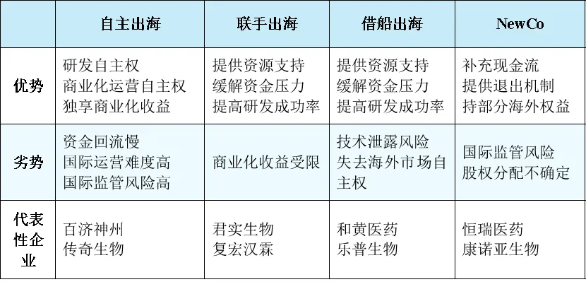 優勢:企業借助海外臨床經驗豐富、商業化能力強且自身發展穩定的合作伙伴,可盡量避免被當地政策壁壘影響,降低出海風險。