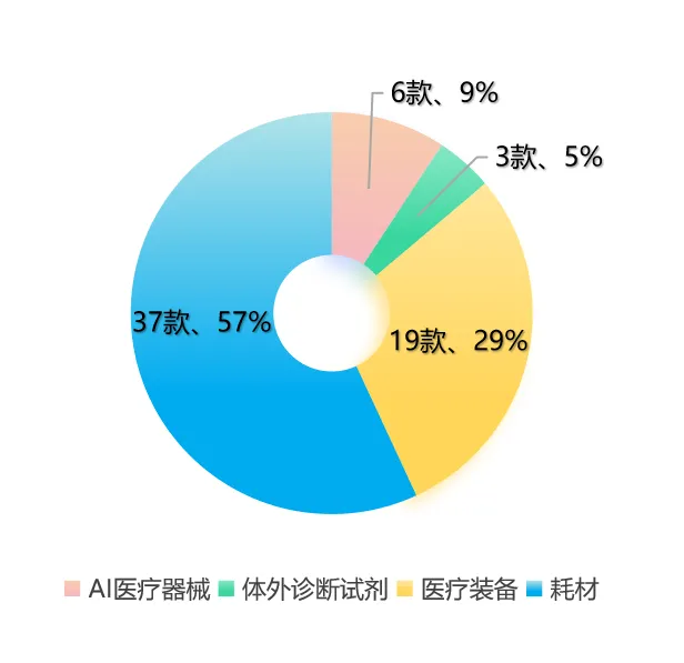 高端植介入耗材產(chǎn)品發(fā)展強(qiáng)勁,占比大幅提升,從去年的46%增加到了57%。高端醫(yī)療裝備獲批增速放緩,占比從41%下降到了29%。AI醫(yī)療器械獲批數(shù)量與去年持平。