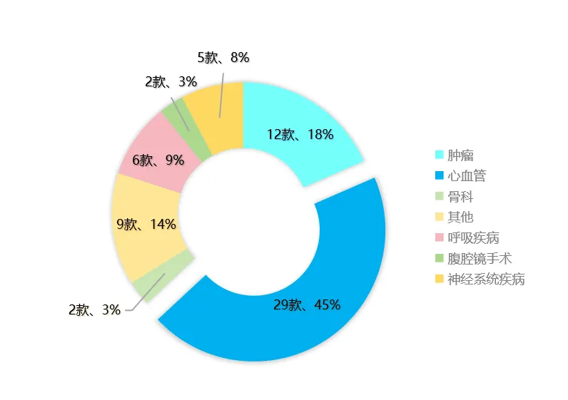 心血管位列第一,共29款產(chǎn)品,占比45%,腫瘤緊隨其后,12款產(chǎn)品,占比18%。這一數(shù)據(jù)與《中國心血管病報告2023》中提到的“中國心血管病死亡率居疾病死亡構(gòu)成的首位,高于腫瘤及其他疾病”成鮮明的對應(yīng)關(guān)系,反映出心血管疾病和腫瘤疾病在我國疾病防治中的重要性和緊迫性。