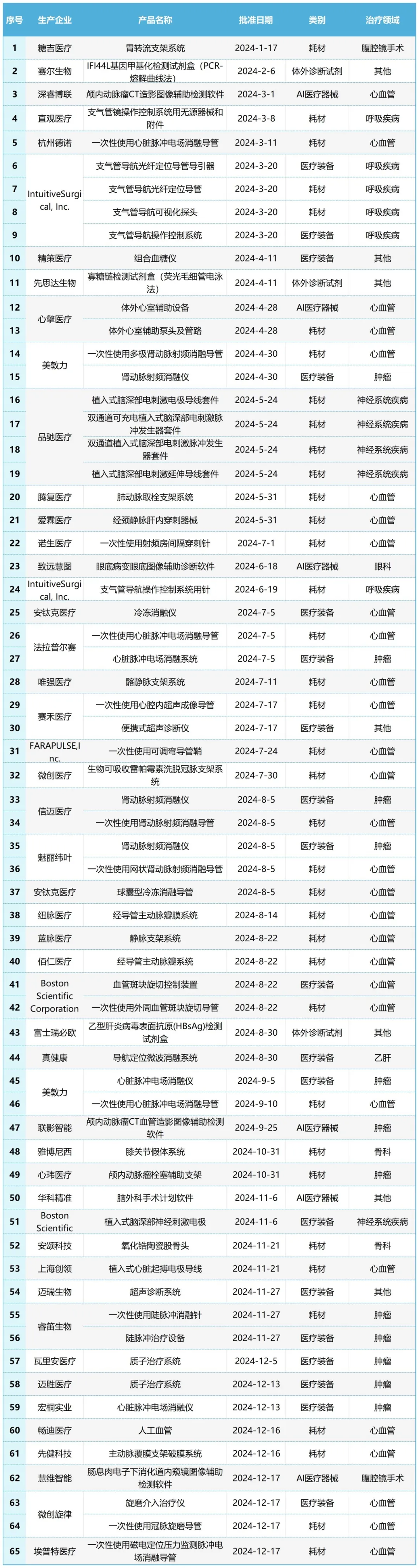 2024年,我國共有65款創(chuàng)新醫(yī)療器械獲得國家藥品監(jiān)督管理局(NMPA)批準(zhǔn)上市,獲批數(shù)量創(chuàng)歷史新高,總體來看國際化發(fā)展態(tài)勢不斷增強(qiáng),區(qū)域集聚效能愈發(fā)顯著,多款運用國際首創(chuàng)技術(shù)的國內(nèi)首款產(chǎn)品接續(xù)發(fā)布,展現(xiàn)出強(qiáng)大的創(chuàng)新能力和高質(zhì)量發(fā)展趨勢。獲批產(chǎn)品具體特點如下: