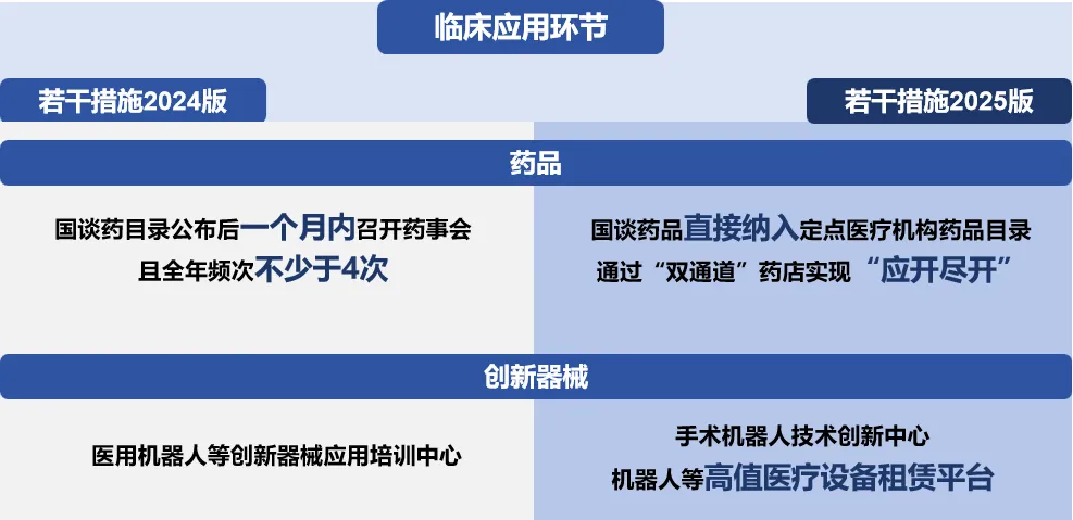 創(chuàng)新藥方面,相較于上海、廣東等地增加召開藥事會(huì)頻次,北京率先提出國談藥可直接納入全市定點(diǎn)醫(yī)療機(jī)構(gòu)藥品目錄,無需召開藥事會(huì),醫(yī)療機(jī)構(gòu)可通過“雙通道”藥店實(shí)現(xiàn)“應(yīng)開盡開”。此外,支持醫(yī)療機(jī)構(gòu)針對(duì)創(chuàng)新價(jià)值高但臨床數(shù)據(jù)較少、實(shí)際證據(jù)不充分的藥物開展真實(shí)世界研究,驗(yàn)證藥物臨床價(jià)值。創(chuàng)新醫(yī)療器械方面,搭建機(jī)器人等高值醫(yī)療設(shè)備租賃平臺(tái),運(yùn)用市場(chǎng)化方式打通創(chuàng)新醫(yī)療器械入院“最后一公里”,破解創(chuàng)新醫(yī)療器械高成本與推廣難的矛盾,加快手術(shù)機(jī)器人入院應(yīng)用和創(chuàng)新迭代。