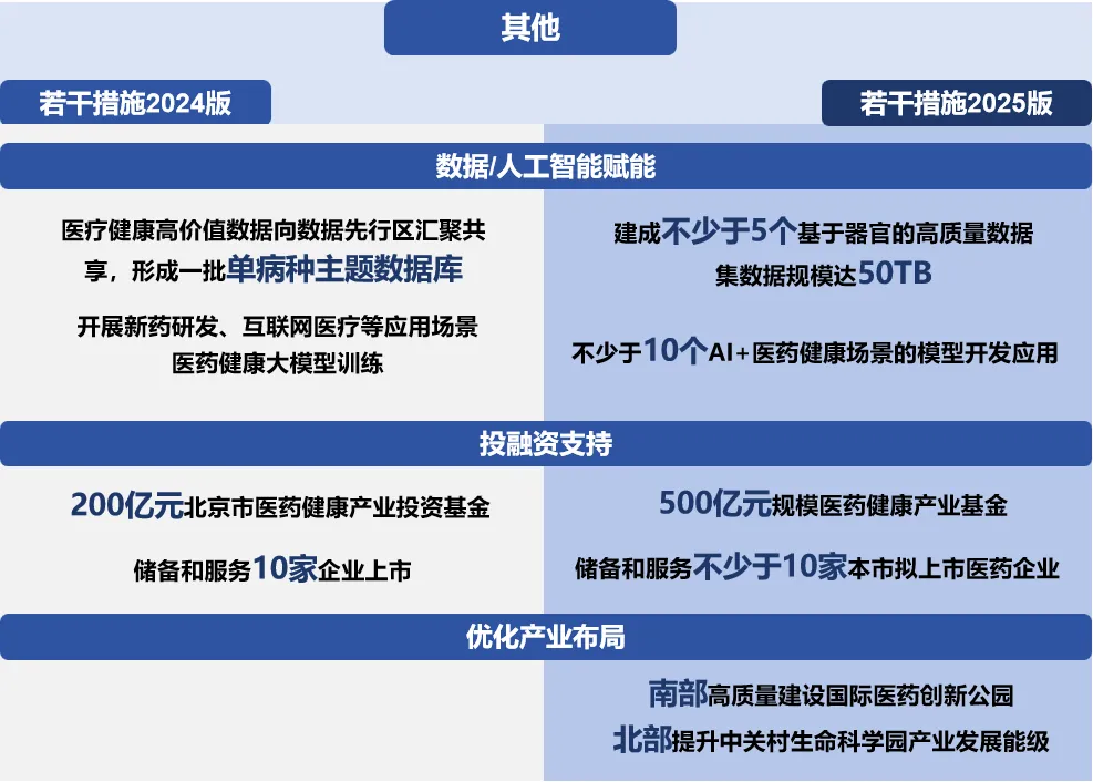 《若干措施2025版》從“數(shù)據(jù)賦能”進(jìn)階到了“人工智能(AI)賦能”,一是持續(xù)探索破解當(dāng)前醫(yī)療數(shù)據(jù)“量不足、質(zhì)不高、用不暢”的問題,在促進(jìn)醫(yī)療數(shù)據(jù)采集、清洗、標(biāo)注規(guī)范化發(fā)展的基礎(chǔ)上,明確提出建成不少于5個(gè)基于器官的高質(zhì)量數(shù)據(jù)集,數(shù)據(jù)規(guī)模達(dá)50TB,賦能AI醫(yī)療模型訓(xùn)練;二是推動(dòng)醫(yī)療行業(yè)大模型從開發(fā)階段進(jìn)入應(yīng)用階段,提出鼓勵(lì)設(shè)立人工智能研發(fā)中心開展人工智能賦能新靶點(diǎn)發(fā)現(xiàn)、新機(jī)制探索等研究,支持AI+病理、輔助診斷、手術(shù)規(guī)劃、制藥等不少于10個(gè)場(chǎng)景的模型開發(fā)應(yīng)用,多舉措推進(jìn)北京市AI+醫(yī)藥健康從“單一場(chǎng)景驗(yàn)證”走向“全鏈條應(yīng)用”。此外,對(duì)于監(jiān)管科學(xué)創(chuàng)新也要求探索AI賦能。