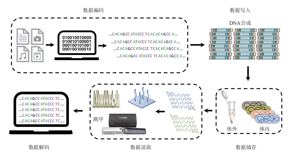 DNA數據存儲是利用人工合成的脫氧核糖核酸(DNA)作為信息載體的前沿存儲技術。作為生物體遺傳信息的天然存儲器,DNA由四種核苷酸構成,分別是腺嘌呤(A)、胸腺嘧啶(T)、鳥嘌呤(G)、胞嘧啶(C)四種堿基,可以翻譯成二進制中的00(A)、01(T)、10(G)、11(C)。在數據寫入時,先將文本、圖片等信息翻譯成二進制代碼,再將二進制代碼轉換為堿基的四進制序列,然后通過人工合成技術生成對應的DNA分子,并放到適宜環境中保存,從而實現數據的高密度存儲。當數據讀取時,再通過DNA測序技術反向操作即可。