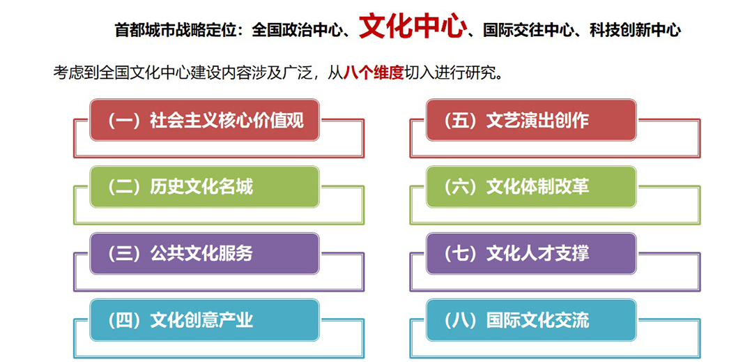 落實(shí)北京市“四個(gè)中心”城市戰(zhàn)略定位,從全國(guó)文化中心的內(nèi)涵和要求出發(fā),聚焦“古都文化、紅色文化、京味文化和創(chuàng)新文化”,明晰全國(guó)文化中心建設(shè)思路,提出發(fā)展目標(biāo),部署重點(diǎn)任務(wù)