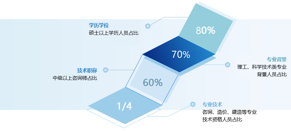 公司為國家高新技術(shù)企業(yè),具有雄厚的咨詢技術(shù)服務(wù)力量,現(xiàn)有員工270余人,其中碩士及以上學歷占80%以上,理工、科學技術(shù)類專業(yè)背景人員占比近70%。